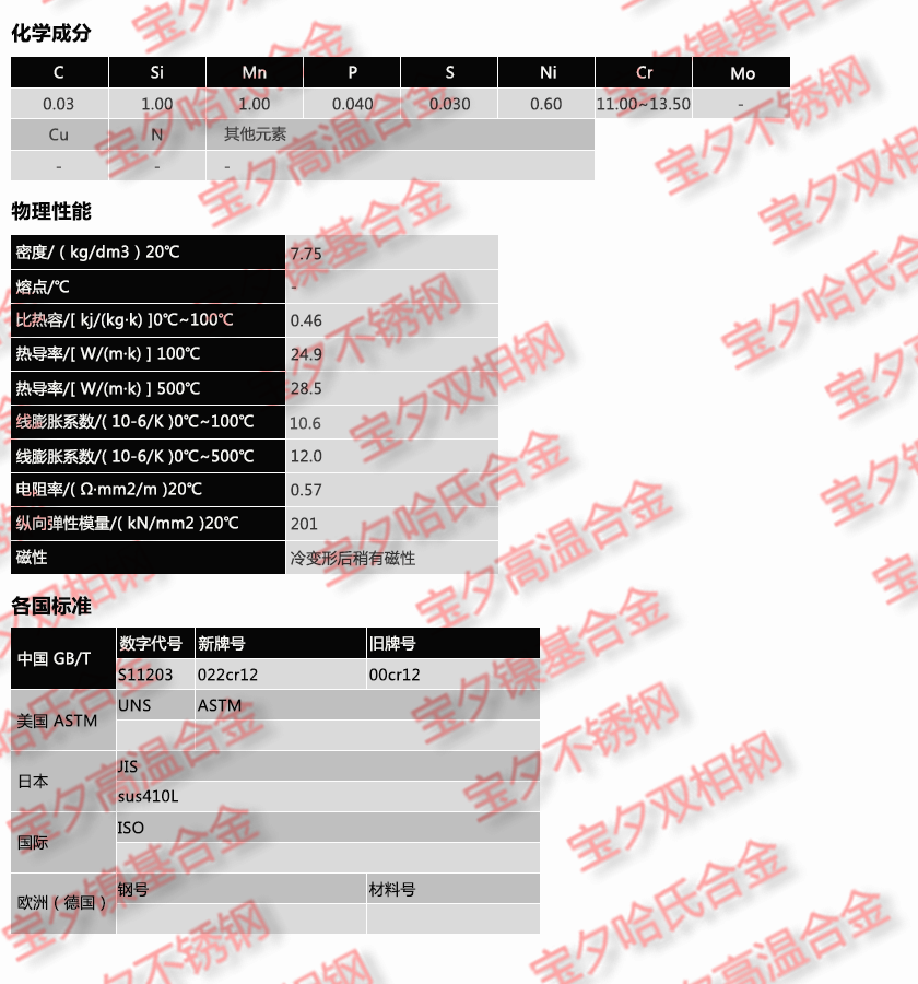 上海宝夕实业—022Cr12材质单,上海宝夕实业—022Cr12成分表,上海宝夕实业—022Cr12是什么材料